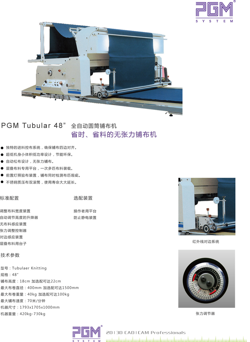 PGM TUBULAER KNITTING 全自動鋪布機采用先進的電子感應器,自動感應鋪布狀態,布料鋪完時,自動停機。 PGM TUBULAER KNITTING 全自動鋪布機能夠根據 PGM CAD 制定的排料長度和訂單要求來設定鋪布層數,而且擁有層數自動記錄功能,達到鋪布層數時,會自動停止。