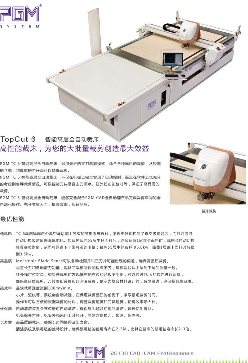 PGM TC6 全自動裁床機 , 采用先進的直刀裁剪模式 , 適合各種不同面料的裁剪 , 從輕薄的絲綢 , 到厚重的牛仔 , 從棉織品,到 PVC 等涂層面料,從服裝行業,到包袋,服飾,都可以精確的裁剪。