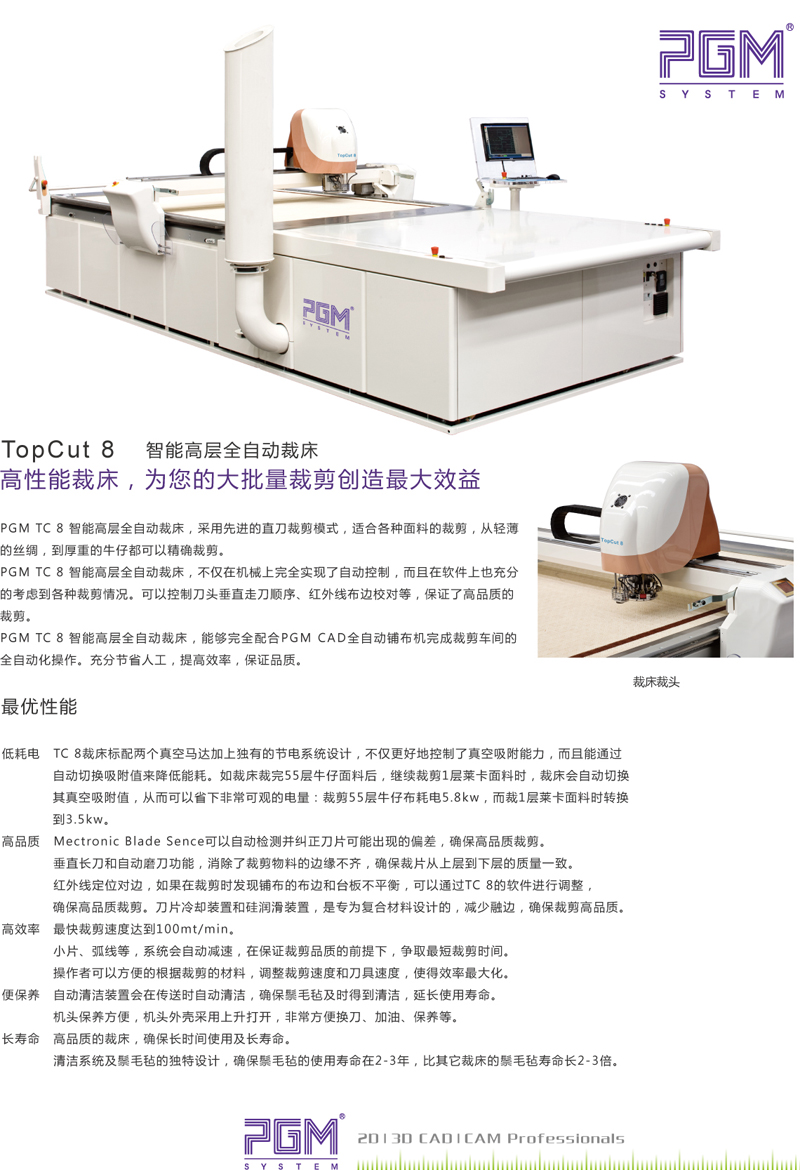PGM TC8 全自動裁床機 , 采用先進的直刀裁剪模式 , 適合各種不同面料的裁剪 , 從輕薄的絲綢 , 到厚重的牛仔 , 從棉織品,到 PVC 等涂層面料,從服裝行業,到包袋,服飾,都可以精確的裁剪。