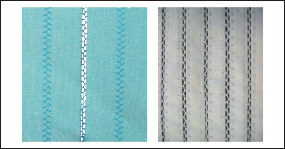 用于兩片布料之接縫,接縫處有魚網(wǎng)狀鏤空效果,使用彩色線效果更加美觀。