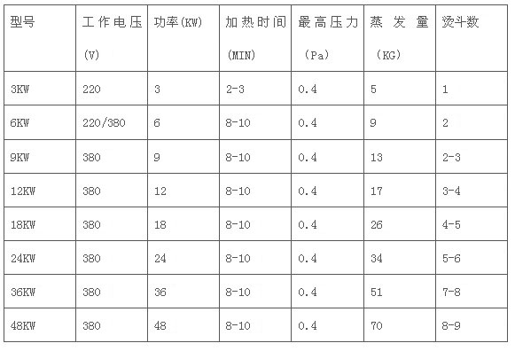 本機特點: 1、采用鍋爐專用GB3087-1999碳崗無縫鋼管,出廠前均經X光透視及超音波檢驗.符合國家制造標準; 2、自動高中低水檢測,防止無水加熱現象,即保證安全又延長發熱系及爐體使用壽命; 3、安全性高的多重自動控制電路附有異常檢測系統,一般人即可操作; 4、升溫快,無環保問題,約8-10分鐘即可使用; 5、體積小|,重量輕,易安裝,搬運,不占用太多空間,保養方便容易; 6、采用 電加熱,無明火,無安全隱患。 主要技術參數: