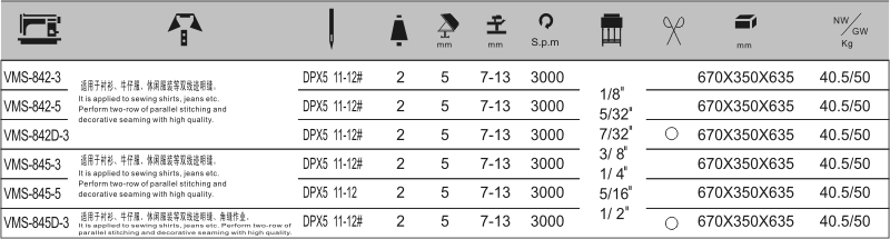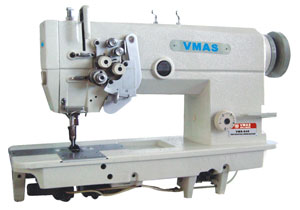 本機采用雙直針,立式自動加油旋梭勾線、滑桿挑線,構成了二行雙線鎖式線跡。針桿采用機械式分離與聯合,上下軸用滾珠軸承支撐,同步齒形帶傳動,采用針桿擺動與送布牙同步送料方式,旋鈕式圓盤調節針距和杠桿式倒順送料機構,在梭心內的縫線回拉彈簧,保證底線與面線得到一致的縫紉效果,適用縫制襯衫、制服、牛仔褲、大衣或類似服裝。