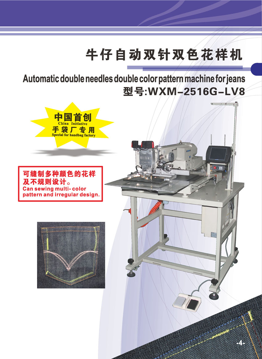 WXM 2516G-LV8 “威喜瑪”雙針雙色花樣機(jī)(手袋廠專(zhuān)用),可縫制多種顏色的花樣及不規(guī)則設(shè)計(jì)。