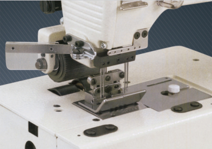 四針平臺型彎針橫向環縫鏈式褲腰縫紉機,后拖輪左右分開,便于轉彎縫。