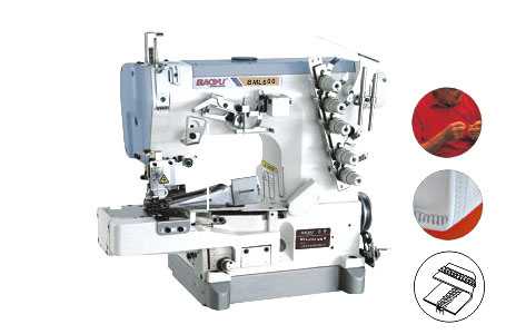 本機型為環縫平車之基本機種,可裝配多種輔助卷邊器,進行多功能之縫合,適用內衣褲、運動衫接縫或下擺車縫。