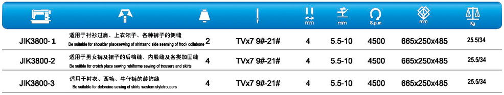 本機采用連桿式送料機構,針桿挑線,彎針勾線,形成雙線鏈式線跡。線跡牢固且富有彈性,適用于服裝內衣,床上用品及薄形包袋和皮革制品的搭接縫、裝飾縫,針間距有五種規格可供選擇。 JIK3800-2為雙針縱列鏈式平縫機;JIK3500-3為三針縱列鏈式平縫機。