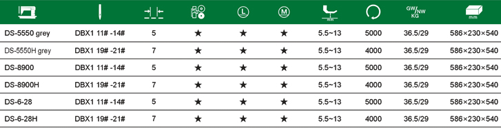 該機造型大方,線條流暢,結構成熟,性能可靠,高速高效,操作空間大。能縫制薄、中厚和厚的縫紉材料,線跡整齊、美觀。合理的倒、順送料機構確保縫薄時不起皺,縫厚時不斷線。強注式潤滑系統使該機在運轉時縫紉性能穩定、噪聲低。