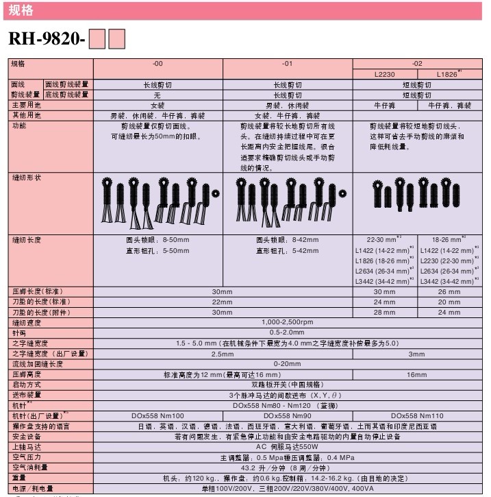 · 能鎖出美麗的扣眼,且線跡精致漂亮。 · 最高縫紉速度達2,500rmp,提高了生產(chǎn)效率。 · 機腔寬大,可放置寬大面料。 · 使用方便易懂的操作盤。 針距:0.5-2.0 mm 針的擺動幅度:1.5-5.0 mm 抬壓腳高度:12-16 mm 縫制長度:5-20 mm 尾結(jié)長度:0-20 mm 最高縫紉速度:2500 rpm 面線剪線裝置為標(biāo)準(zhǔn)裝備