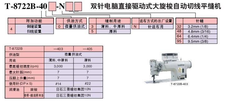 · 穩定的自動切線功能和大旋梭裝置提高了工作效率。 · 無油污清潔縫制。 微油式 用于薄·中厚面料/厚面料 最高縫紉速度:3,000 rpm 最大針距:7 mm 抬壓腳高度:7 mm 針送布/下送布為標準裝備 倒縫裝置&掃線裝置為標準裝備