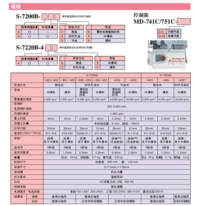 · 反應(yīng)敏捷、縫紉舒適。 · 沒有油污的清潔縫紉。 · 簡單易懂、使用方便的操作控制盤。 · 噪音低、振動小、縫紉機操作舒適。 無油/針桿無油/微油 用于薄料和難縫面料/中厚面料/厚面料 最高縫紉速度:4,000-5,000 rpm 最大針距:4.2-5 mm 抬壓腳高度:6-16 mm