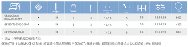GK380系列超高速繃縫機(jī) 本機(jī)型系方筒式繃縫機(jī)基本機(jī)種,可加裝多種附件以適用于不同作業(yè);本機(jī)型標(biāo)準(zhǔn)配件中附有一般下擺車縫導(dǎo)模,可適用于一般下擺車縫作業(yè)。