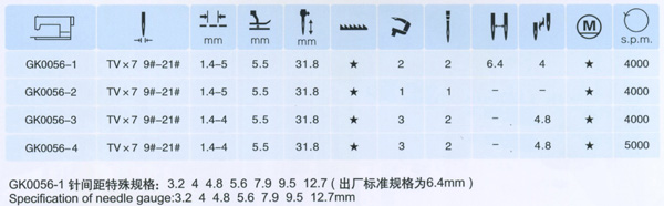 GK0056-1/-2/-3 本機采用連桿式送料機構,針桿挑線、彎針勾線,形成雙線、三線鏈式線跡。線跡牢固且富有彈性,適用于內衣、床上用品、薄型包袋和皮革制品的搭接縫、裝飾縫及薄料、中厚料服裝的縫制。轉速可達5000轉。 GK0056-1針間距有八種規格可供選擇 3.2 4.0 4.8 5.6 6.4 7.9 9.5 12.7mm(標準為6.4mm)。