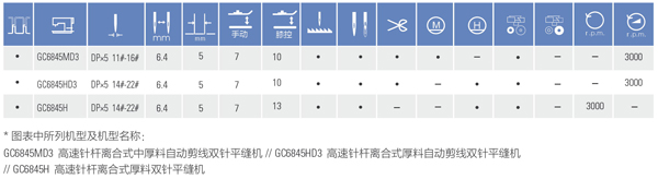 GC6845系列高速針桿離合式雙針平縫機(jī) 該機(jī)采用針桿變位及轉(zhuǎn)動(dòng)系統(tǒng)性能穩(wěn)定、縫紉線跡美觀平整;上下軸采用高精度同步轉(zhuǎn)動(dòng),滾珠、滾針軸承支撐;機(jī)針與送布牙同步送料方式防止布料起皺與滑移,旋鈕式調(diào)節(jié)針距和杠桿式倒送料機(jī)構(gòu),操作方便;適用于縫制襯衫、內(nèi)衣、制服、牛仔衣褲、大衣等,線跡整齊美觀。針間距特殊規(guī)格:3.2/4.0/4.8/6.4/7.9/9.5/11.1/12.7/15.9/25.4/31.8/38.1mm