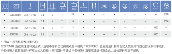 GC6875系列直驅高速針桿離合式大旋梭雙針平縫機 該機采用微量循環供油,避免了對衣料的污染;針桿變位及傳動系統性能穩定、縫紉線跡美觀平整;上下軸采用高精度同步傳動,滾珠、滾針軸承支撐;機針與送布牙同步送料方式防止布料起皺與滑移,旋鈕式調節針距和杠桿式倒送料機構,操作方便;適用于縫制襯衣、內衣、制服、牛仔衣褲、大衣等,線跡整齊美觀。針間距特殊規格:3.2/4.0/4.8/6.4/7.9/9.5/11.1/12.7/15.9/25.4/31.8/38.1
