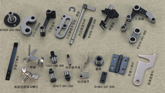 三吼連桿、小壓腳提升導軌、滑塊、螃蟹座、三角貓、牙架下彈片、底座連座接勾螺釘、抬壓板手肖、抬壓板手、套筒、后蓋小荷葉、底座連接勾