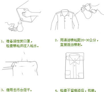 此類產品引用和改進日美配方,經高科技研發生產而成,屬環保型,具有環保快捷、去污力強等功效,適用于解決布料、皮革、毛衣等物料上的油漬。本產品須配套噴槍、吸風機等輔助工具同步操作,以達到快速徹底去油污。