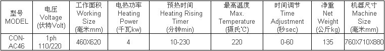 上工作面熱采用鐵氟龍材料,清潔容易,耐用。下工作面采用高溫矽膠熱料。時間,溫度及壓力控制,均可按質料要求而作出適當調節。完成工序音樂提示。