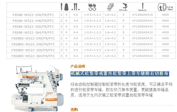 F858K-W522,F858KD-W522 機械式松緊帶或蕾絲松緊帶上帶車縫附右切修布