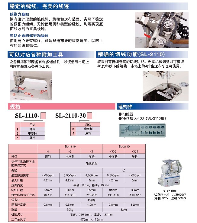 用于薄料/中厚面料/厚面料 最高縫紉速度:4,000-5,000 rpm 最大針距:4.2-5 mm 抬壓腳高度:6-13 mm