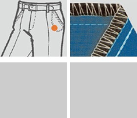 在褲袋邊緣多上一包邊布條, 以強化縫合處,增加美觀 注 : 標準喇叭之入布寬度為3/8”(9.5mm)