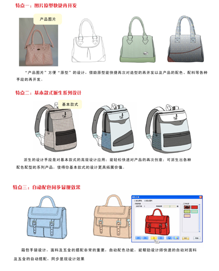 秀革箱包設計系統是專業的設計工具,填補了箱包產品開發工作中設計的信息化應用的空白,幫助企業在設計環節提高核心能力。