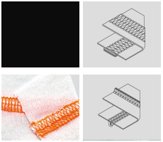 適宜中厚布料,經三線拷克車縫后再包縫,用于運動服、汗衫等領口、下擺、袖管等之拷邊車縫后加以包縫,可增加服飾之美觀及車縫之牢固,利用導布片及押具上之押刀導縫,可避免車縫時彎曲不直