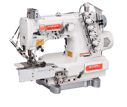 將環(huán)形羅紋松緊帶縫入原體,適用于男女內(nèi)褲、褲腰之羅紋松緊帶包縫再配合自動(dòng)切線裝置及筒型衣物撐開滾輪組,更能提高縫製效率 注 : 本機(jī)型標(biāo)準(zhǔn)配備二折式導(dǎo)布片,可另訂三折式導(dǎo)布片
