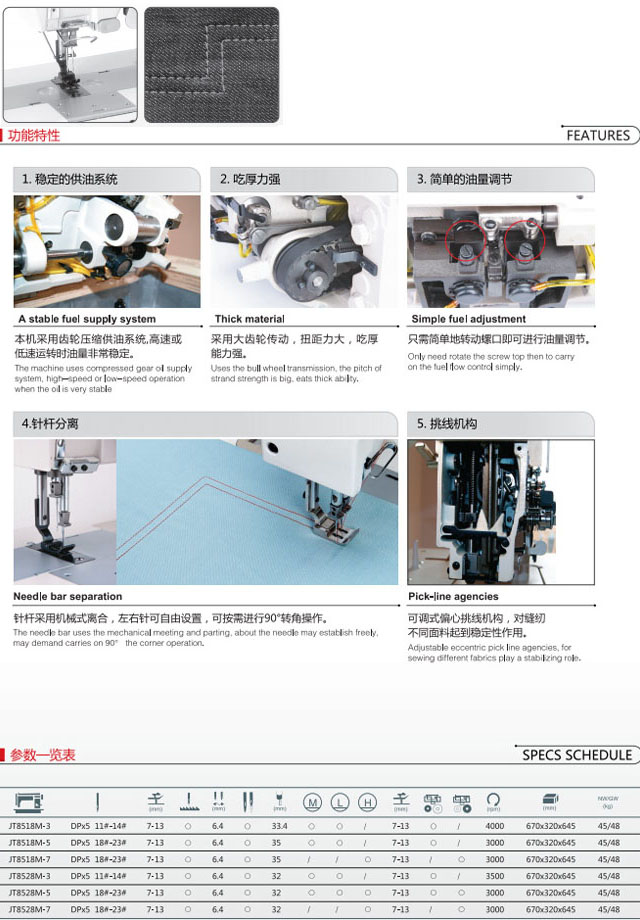 本機采用雙直針、立式自動加油旋梭勾線,滑桿挑線,構成二行雙線鎖式線跡。針桿采用機械式分離與聯合;上下軸用滾珠軸承支承,同步齒輪形帶傳動;柱塞式油泵潤滑系統。采用針桿擺動與送布牙同步送料方式,旋鈕式圓盤調節針距和杠桿式倒順送料機構,在梭心內的縫線回拉彈簧,保證底線與面線得到一致的縫紉效果,適用縫制大衣、制服、牛仔褲、包袋、裝飾縫等。