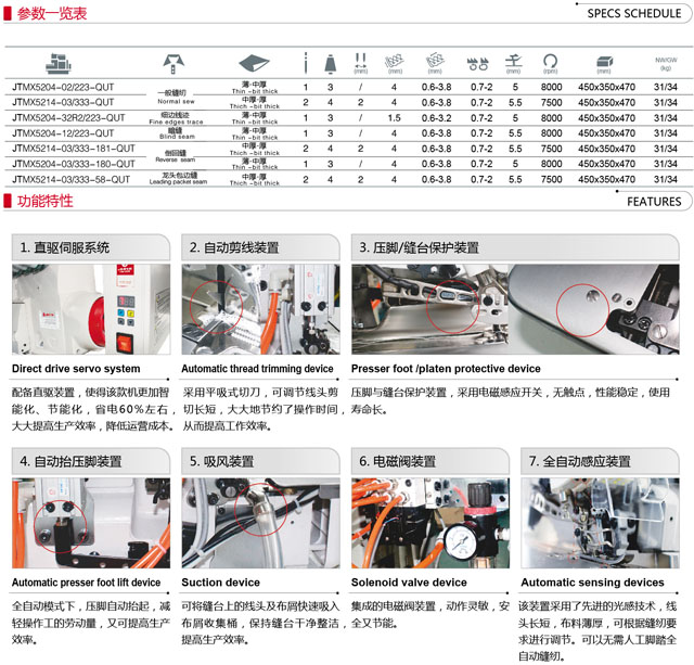 JTMX5200-QUT超高速包縫機,最高縫速可達8000轉;可自動抬壓腳、加裝吸線及切線裝置,采用了電腦直驅內置伺服馬達省電60%左右;在針桿、搖桿部位增設吸油裝置,避免漏油;單支撐針桿結構,易實現高速運轉;針桿機構封閉防止灰塵吸入,防止針桿的磨損及漏油現象發生;加裝濾油器,提高油的清潔度,保證高速運轉;最大限度增加了操作空間,使操作更加舒適、方便、保證縫制線跡的優美。