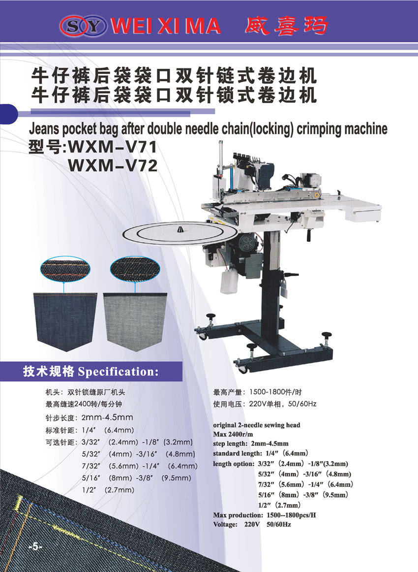 WXM-V71系列“威喜瑪”牛仔褲后袋袋口雙針鏈式卷邊機