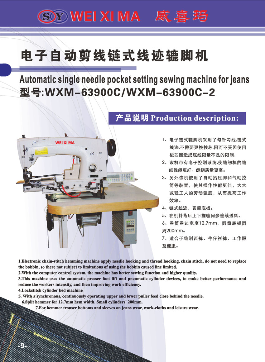 熱門產品: WXM1010G-V2 “威喜瑪”牛仔褲自動貼皮牌機   WXM 2516G-LV8 “威喜瑪”雙針雙色花樣機(手袋廠專用)   WXM2516G-V8F “威喜瑪”牛仔褲自動雙針雙色裝袋機(貼袋機)   威喜瑪(WXM-2516G-V6)牛仔褲單針自動貼后袋機(裝袋機)   WXM1010G-V3F 威喜瑪牛仔褲自動鈕牌(門襟)機