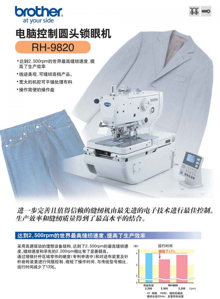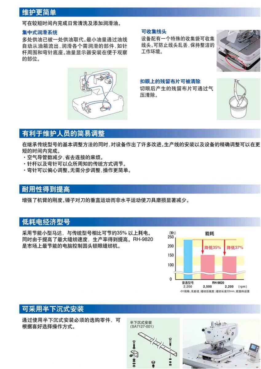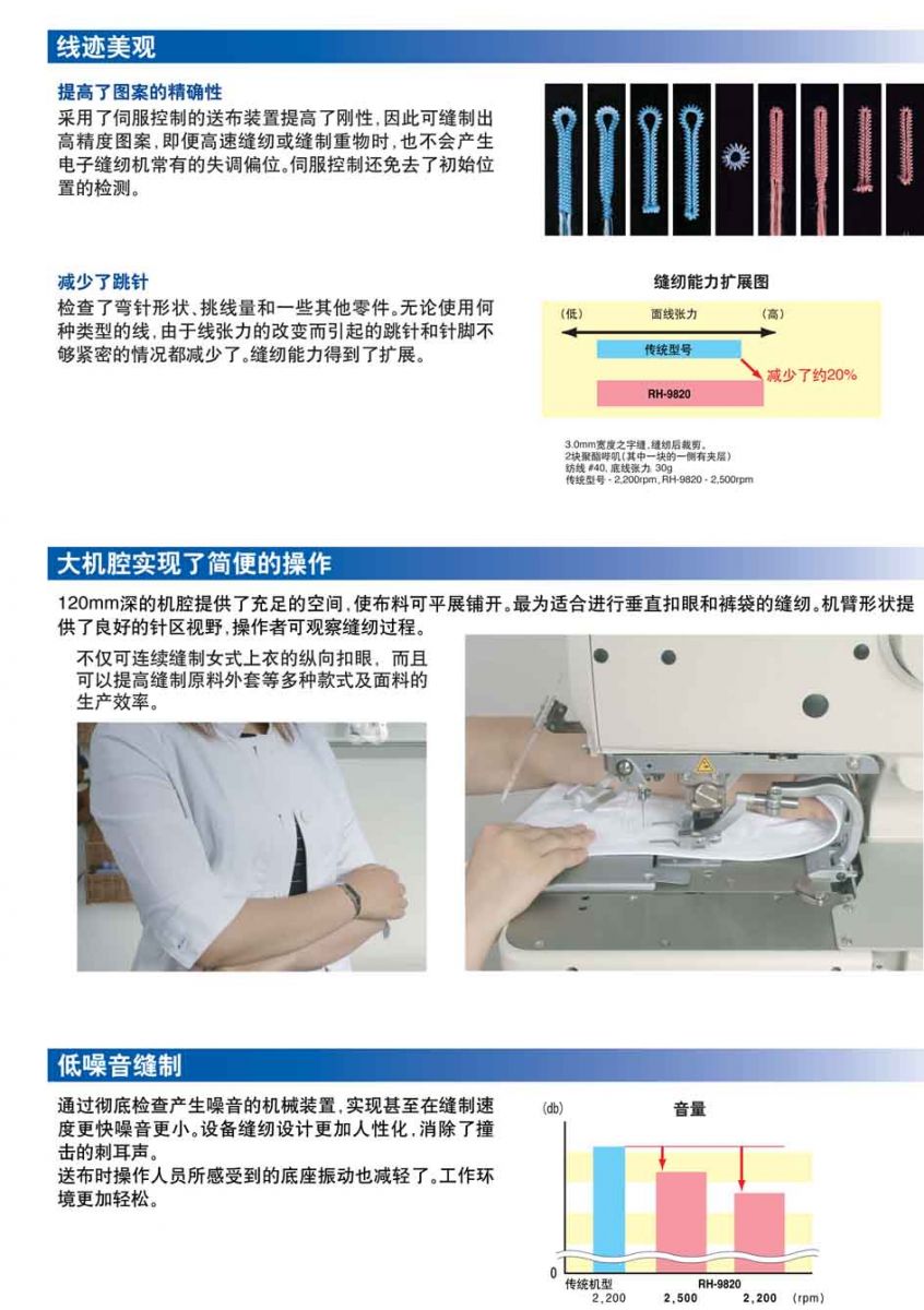 · 能鎖出美麗的扣眼,且線跡精致漂亮。 · 最高縫紉速度達2,500rmp,提高了生產效率。 · 機腔寬大,可放置寬大面料。 · 使用方便易懂的操作盤。 針距:0.5-2.0 mm 針的擺動幅度:1.5-5.0 mm 抬壓腳高度:12-16 mm 縫制長度:5-20 mm 尾結長度:0-20 mm 最高縫紉速度:2500 rpm 面線剪線裝置為標準裝備