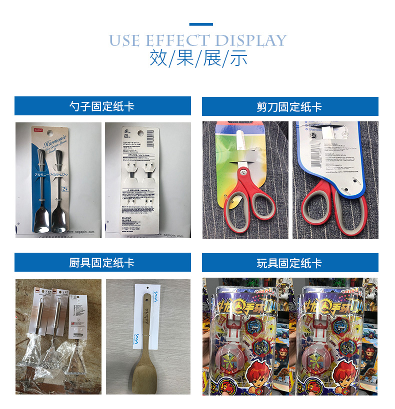 小五金、玩具、 廚具、家居用品等包裝固定。配合可調(diào)式膠釘機(jī)使用。