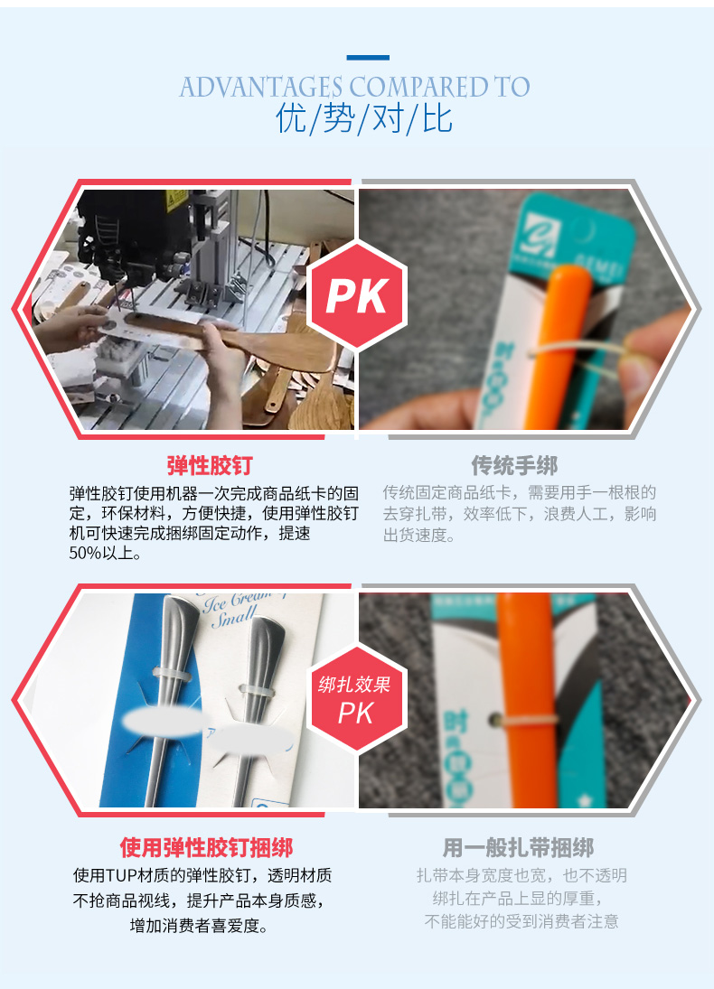 A、高效:代替線綁、鐵絲捆,更方便更快速完成捆綁固定動(dòng)作,可提速50%以上。