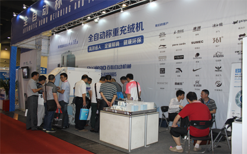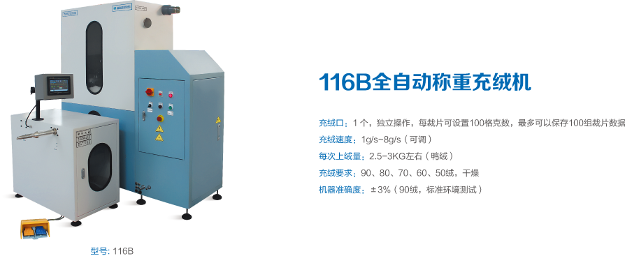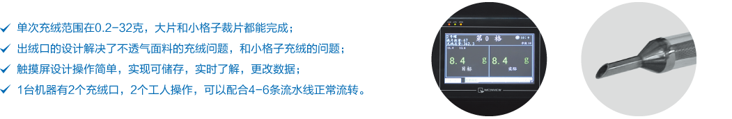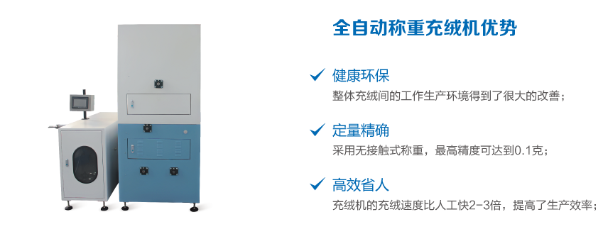 利用高壓氣體吸取羽絨,通過全自動稱重裝置,將設定克重的羽絨精準充入裁片。