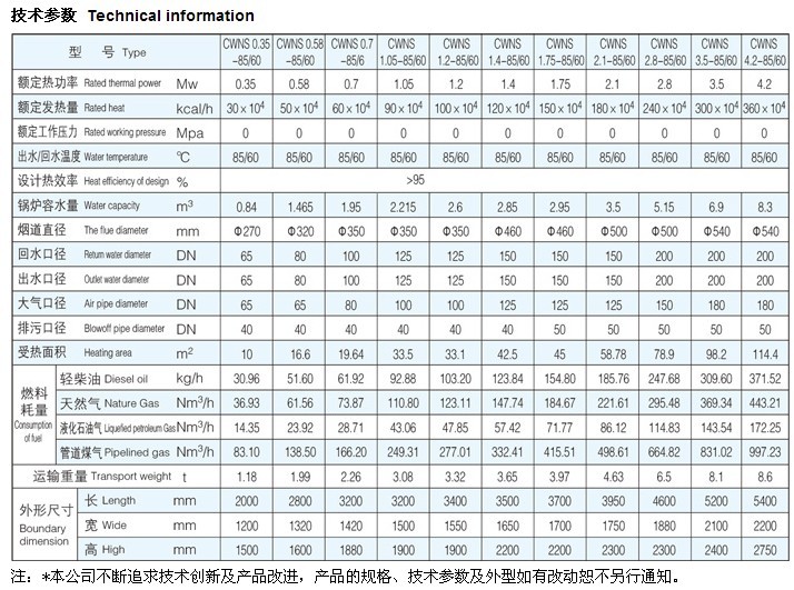 1、CWNS型系列為臥式內(nèi)燃濕背式鍋殼鍋爐。由鍋殼、爐膽、回燃室、前后煙箱、火管等組成。