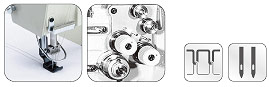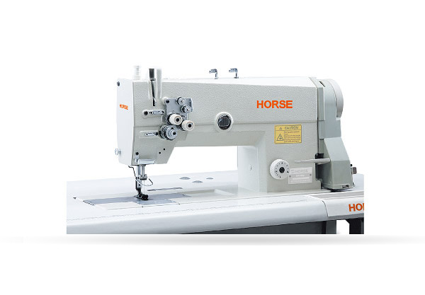 本機采用雙直針、立式自動加油,旋梭勾線,滑桿挑線,構成兩行雙線鎖式線跡;針桿采用機械式分離與聯合,上下軸采用滾珠軸承,同步齒形帶傳動,柱塞式油泵潤滑系統,采用針桿擺動與送布牙同步送料方式,旋鈕式標盤調節針距和杠桿式倒順送料機構,在梭芯內的縫線回拉彈簧,保證底線與面線得到一致的縫紉效果,適用縫制大衣、制服、牛仔褲、包袋、裝飾縫等。