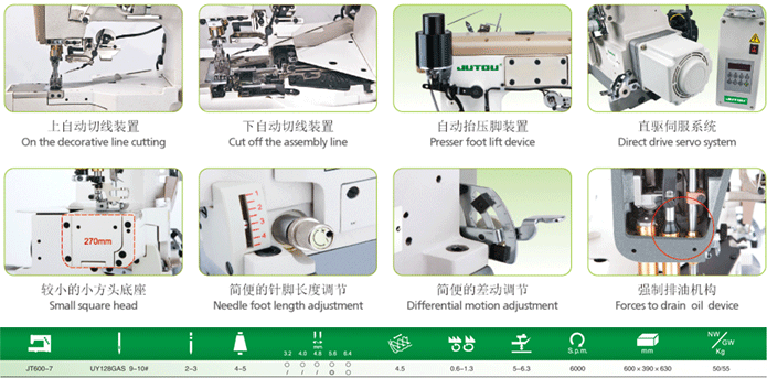 本機配備自動剪線裝置,只要將踏板向后踏,便可簡單操作的電氣式切線刀,把針線、彎針線、喂針線(上叉針線)快速的切斷,無需再用小剪刀作修理,提高工作效率。而且,有自動抬壓腳功能的UT裝置在切線后,壓腳自動抬起,迅速敏捷的進入下一個環節,大大減少以往重復操作工序,從而節省工時、提高生產效率、間接支持生產進度的加快,使得該款機更加省電,從而降低運營成本。