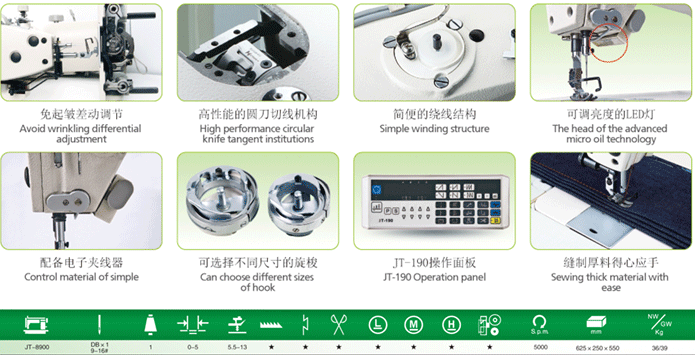 本機(jī)具有自動(dòng)定針位、自動(dòng)定針數(shù)、自動(dòng)計(jì)數(shù)倒順縫、自動(dòng)剪線、自動(dòng)撥線、自動(dòng)抬壓腳等多種智能縫紉模式。適用于針織品、襯衫、西服,休閑服、牛仔等一般薄料,中厚料縫制。