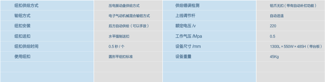 使用自動輸鈕機,平均每分鐘能釘10-15個鈕扣左右,是人工2-3倍,每天可縫衣片850-950(6眼/片)。由于縫制條件(釘眼數(shù)、針數(shù)等)不同而有所不同。