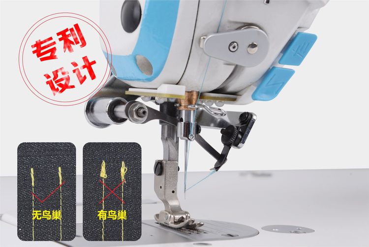 通過少鳥巢裝置,使起縫面料底部鳥巢減小到最低,線跡更加美觀。