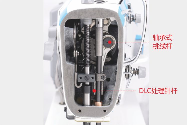 針桿采用DLC工藝處理,配以軸承式挑線桿,經久耐用。同時,采用進口固體潤滑脂潤滑,解決頭部油污帶來的煩惱。