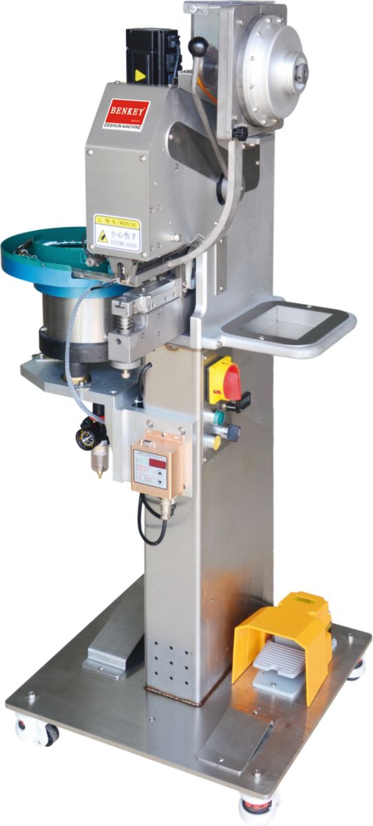 把鈕扣放進對應的4個料斗,開機會自動轉動料斗,自動把鈕扣排滿軌道,自動把鈕扣送到上下模具,電動伺服馬達帶動,只要踩下踏腳開關便可裝訂自如,簡單易用。上下模具對向運動,穿透力好。更換配件可以裝訂其它鈕扣。