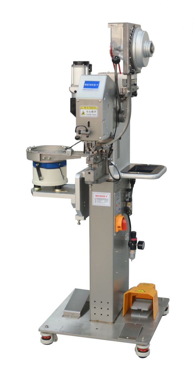 把鈕扣放進(jìn)對(duì)應(yīng)的2個(gè)料斗,開機(jī)會(huì)自動(dòng)轉(zhuǎn)動(dòng)料斗,自動(dòng)把鈕扣排滿軌道,自動(dòng)把鈕扣送到上下模具,伺服電機(jī)驅(qū)動(dòng),只要踩下晴腳開關(guān)便可裝訂自如,簡(jiǎn)單易用。更換配件可以裝訂其它鈕扣。