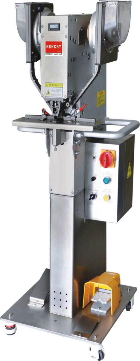 把鈕扣放進對應的2個料斗,開機會自動轉(zhuǎn)動料斗,自動把鈕扣排滿軌道,自動把鈕扣送到上下模具,伺服電機驅(qū)動,只要踝下踏腳開關便可裝訂自如,簡單易用。上下模具對向運動,穿遺力好。更換配件可以裝訂其它鈕扣。