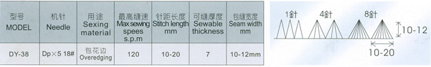 DY-38 可依不同的線、布料與針距搭配出多樣式的貝形花邊,籍由移動針數調整桿便可變 3 種不 同 的針織樣式,共有 1 針 4 針或 8 針之貝殼飾縫。